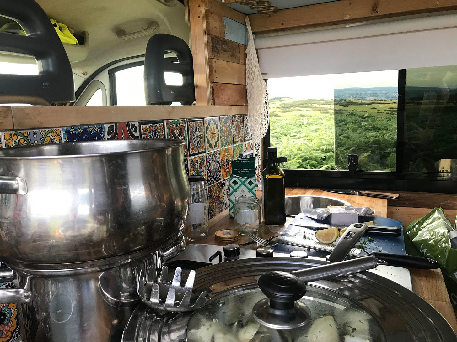 The final act. Last night. Myself and a handful of people I haven’t known for that long but that accepted me into their long standing group with open arms travelled to Hay-on-wye, a pretty town on the Welsh border known for its book festivals and idyllic scenery. We pottered about in central Hay and then all drove up to the hills for a walk, maybe a hike, kind of halfway between. It was a worry at first on my arthritic joints, but I soon realised that my supposed ‘limitations’ were in my head. While it did hurt, I could keep going and although I do have a sneaking feeling that I could do longer term damage to myself if I assume this attitude regularly, it was refreshing to do something I didn’t think I could do and to do it seamlessly. We came down and cooked together. In one of their vans was a full gas canister setup hob, working taps, even an extractor fan! I was suddenly thrown into sous cheffing (if you can call draining the pasta sous cheffing!) Making a beautiful Vongole with clams from an ice box as the sounds of ‘Hozier radio’ drifted off over the hills. All the ingredients he had opted for were up-brand. The good parsley, the good wine, the finishing salt and olive oil. The whole thing was monté -d until the sauce clung to the pasta, a thin film of butter, as decedent as it sounds. We tossed in some finishing touches and served in camping bowls. I spoke to the chef a bit later and he told me how he worked a full-time job he hated years ago in order to afford it all. The kitchen was DECKED (he still managed to forget any tea towels though!)